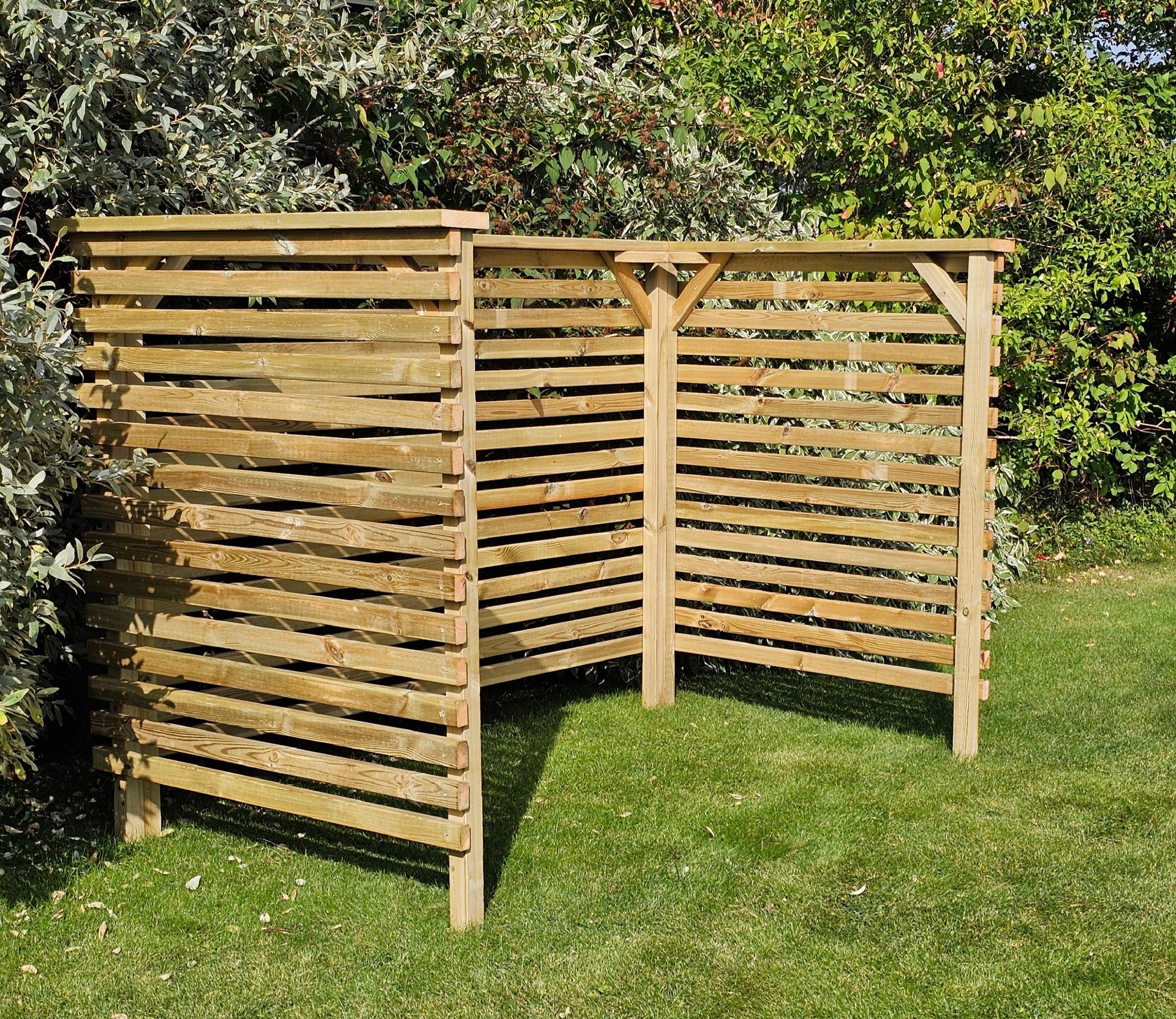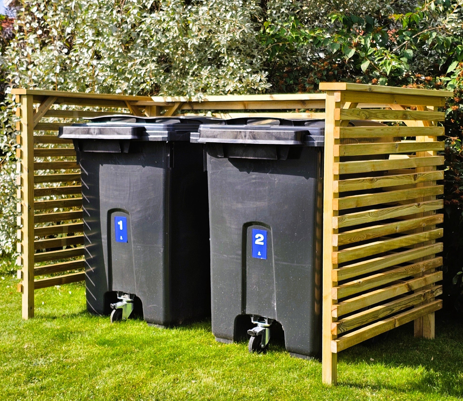 Letar du efter ett stilrent sätt att gömma dina fyrfackskärl? Den här soptunneförvaringen i tryckimpregnerat trä är perfekt för dig som vill kombinera funktion, kvalitet och ett naturligt utseende i trädgården.